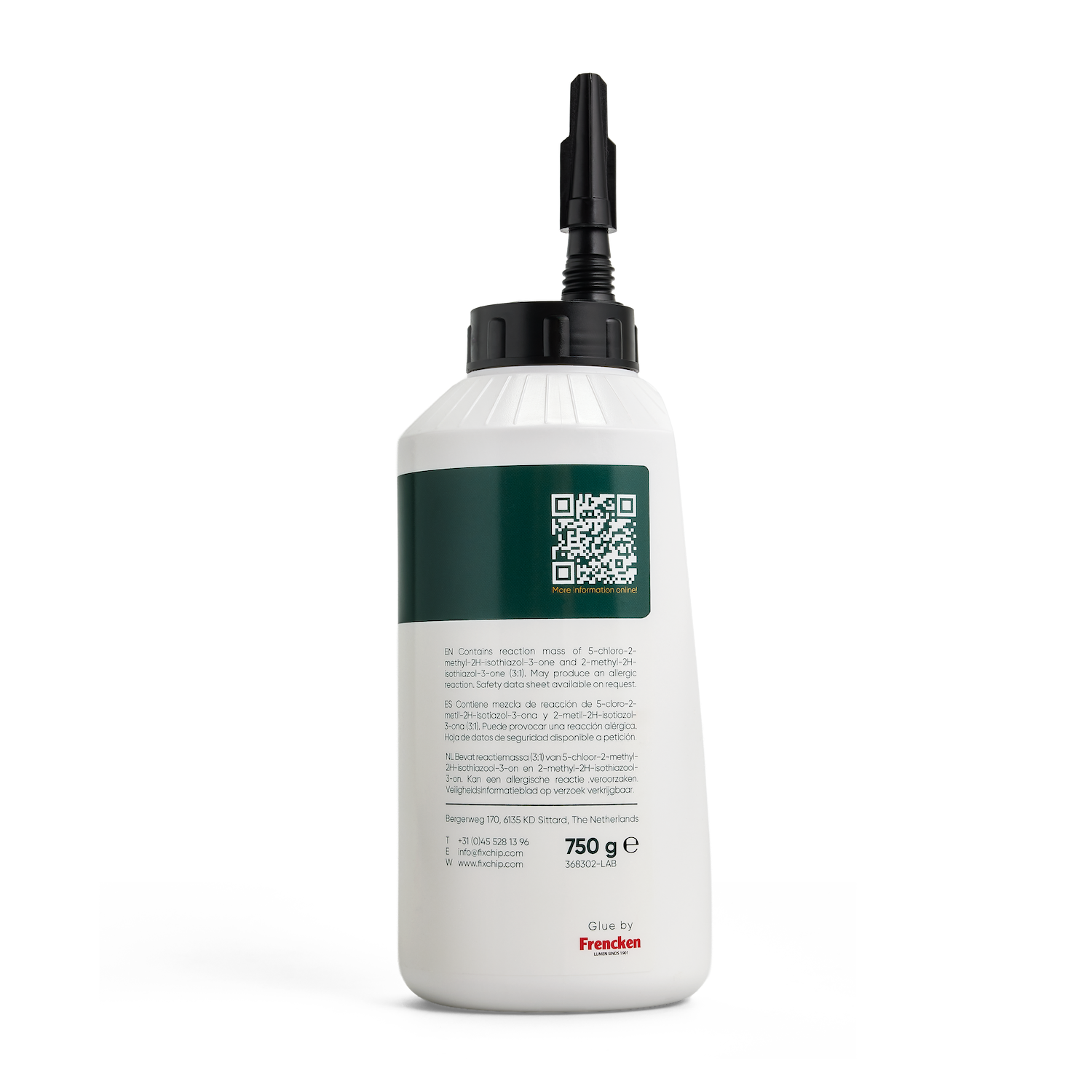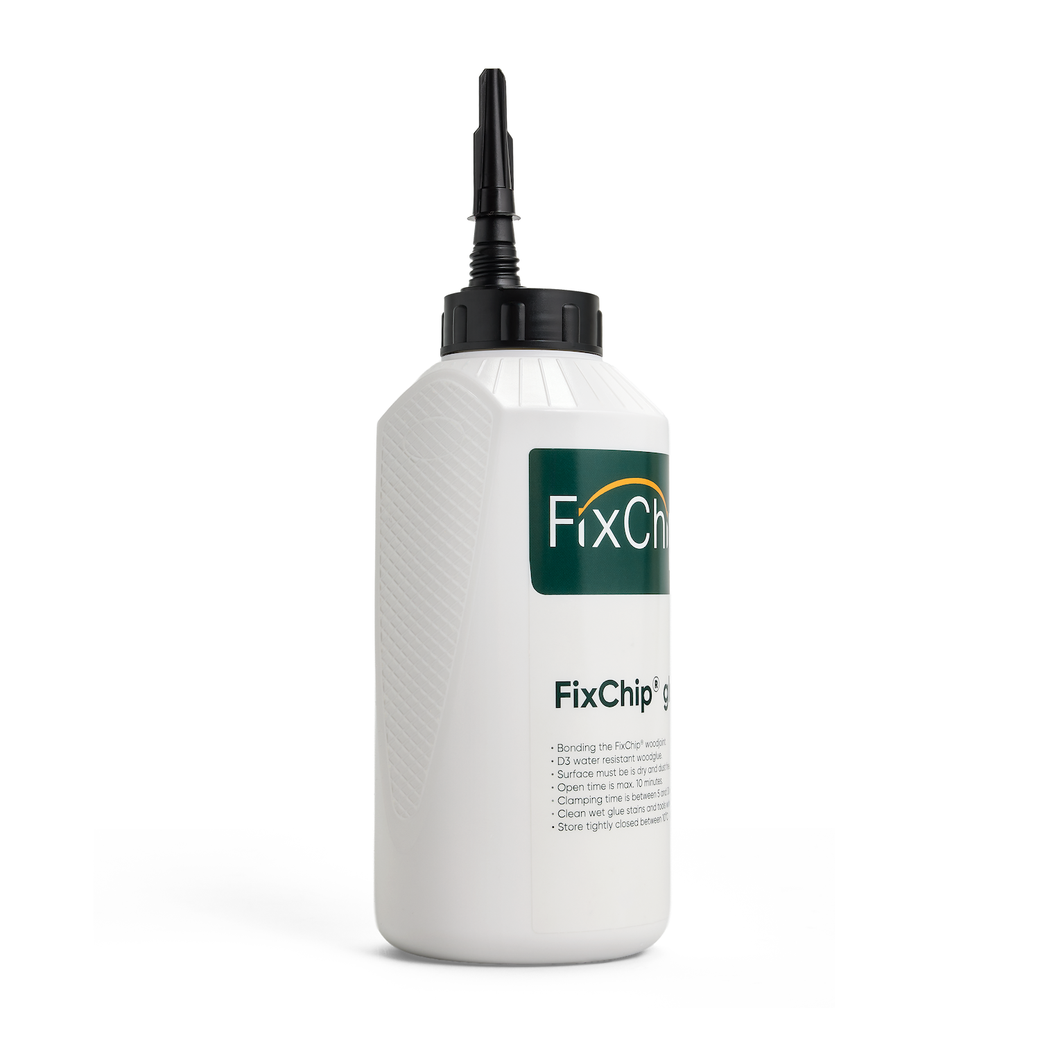 Pegamento FixChip® D3 de Frencken. Nuestro pegamento D3 está especialmente formulado para una unión óptima de FixChips en sus proyectos. Además de los productos FixChip®, el pegamento también se puede utilizar de forma universal para otras uniones de madera. El pegamento FixChip® se suministra en botellas de 750 ml.